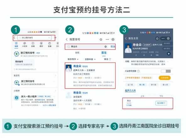 打开支付宝,搜索“浙江预约挂号平台”,快速完成预约。具体流程请见下图。