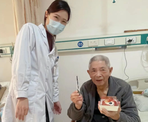 一位收到祝福的奶奶拉着护士的手: