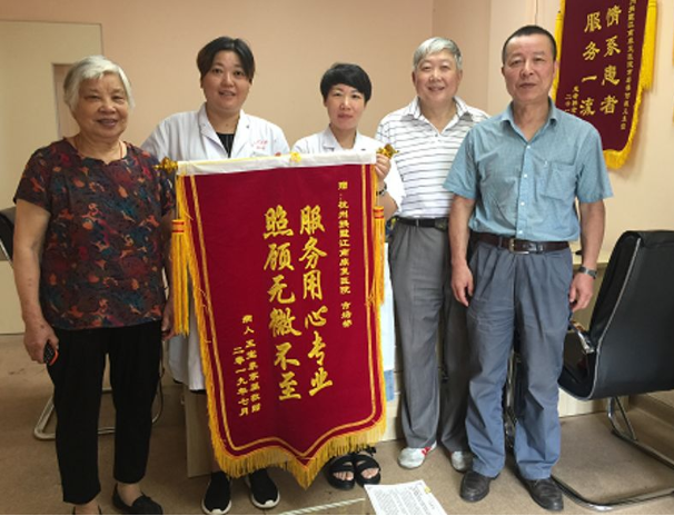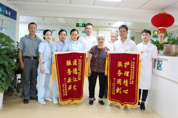 2019年7月19日上午,杭州拱墅江南康复医院再次上演了温馨的一幕,患者王保泉家属手捧锦旗来到院内,再三感谢院领导姚民强及科室全体医护人员对她老伴的精心治疗和护理。