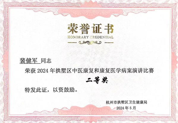 为了进一步推动中医康复和康复医学质控标准化、规范化、科学化管理,不断提升医师在康复领域的中西医联合临床实践能力,拱墅区卫健局、区中医康复质控中心、康复医学质控中心在2024年5月18 日举行了中医康复和康复医学病案演讲比赛。经过四小时激烈的角逐,我院康复科康复治疗师裴健军以扎实的基本功、饱满激昂的演讲在13家社区卫生服务中心、8家民营医院的21名选手中脱颖而出,获得第二名的好成绩。
