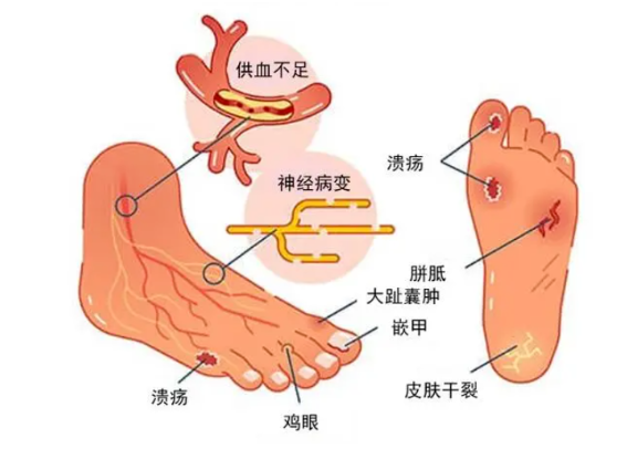 最严重和治疗费用最高的慢性并发症之一,可导致组织溃疡和坏疽,重者可致截肢。糖尿病患者应定期检查足部,穿着合适的鞋袜,去除和纠正易引起溃疡的因素。