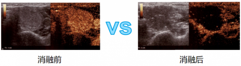 使用造影剂后散射回声增强,明显提高超声诊断的分辨力,敏感性和特异性的技术。在甲状腺乳腺结节消融前、中、后的评估都起到了重要作用。消融前治疗规划: