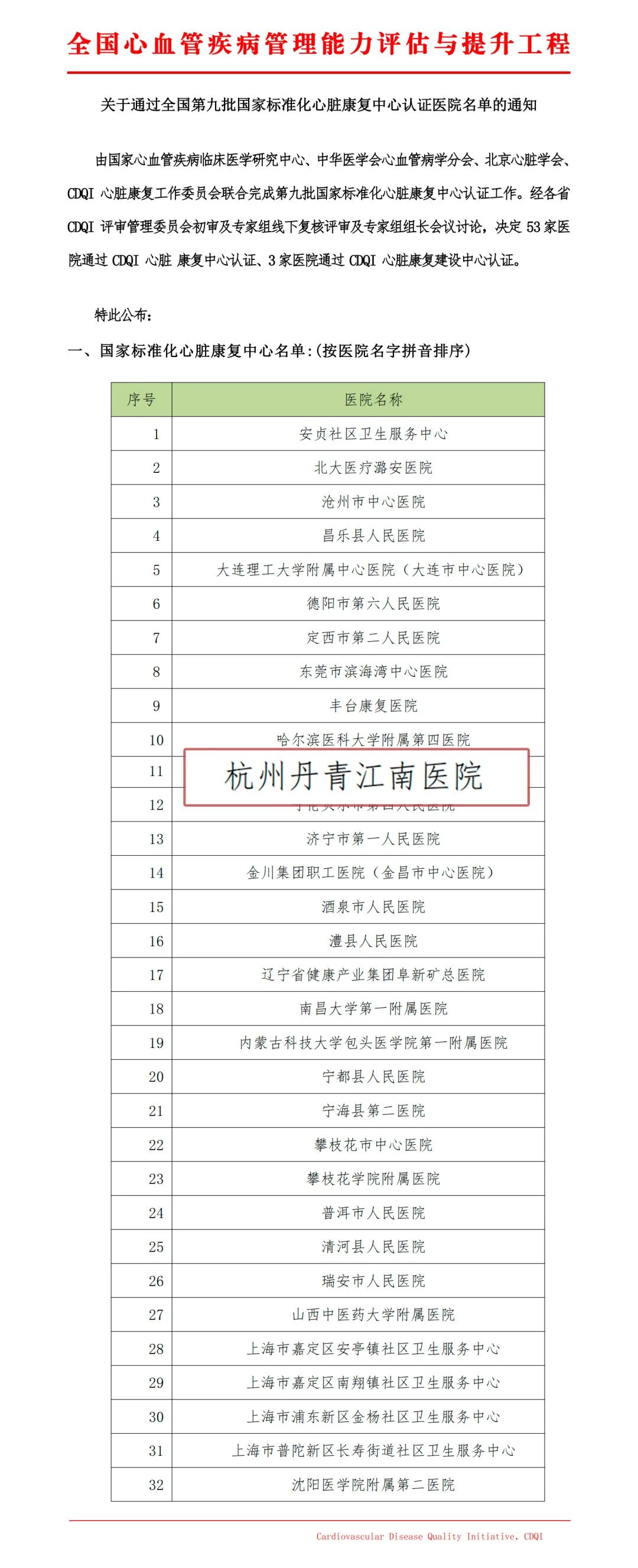 由国家心血管疾病临床医学研究中心、中华医学会心血管病学分会等权威机构联合认证的全国第九批国家标准化心脏康复中心名单正式公布,杭州丹青江南医院以卓越的医疗质量和服务能力通过评审,获得全国第九届“国家标准化心脏康复中心”认证!